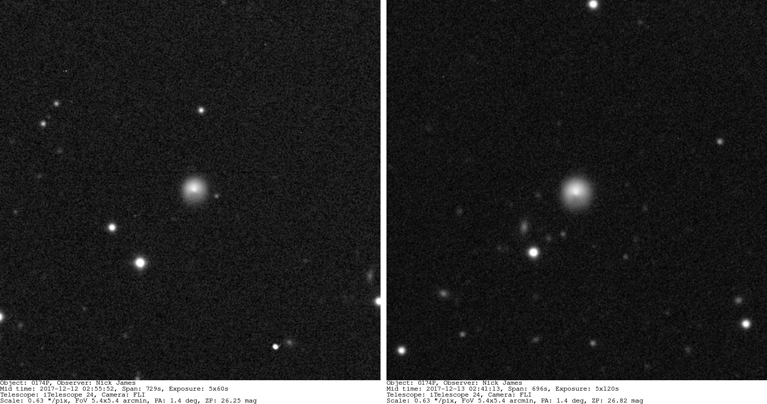 Here's a comparison almost exactly a day apart taken with the same instrument (iTel T24 at Cloudcroft). The coma diameter has gone from 23.3 arcsec to 29.6 arcsec which I think implies a physical expansion rate at the comet of around 170m/s. I get the following unfiltered magnitudes in a 31 arcsec diameter aperture and using UCAC-4 R mags as reference: 20171211.94495 13.59 # C11 + FLI6303, Chelmsford 20171212.12214 13.65 # iTelescope T24 (FLI-PL09000), Cloudcroft 20171213.11196 13.59 # iTelescope T24, Cloudcroft |