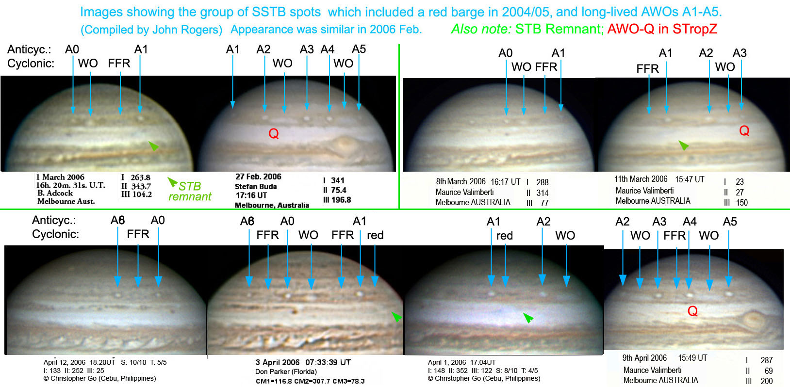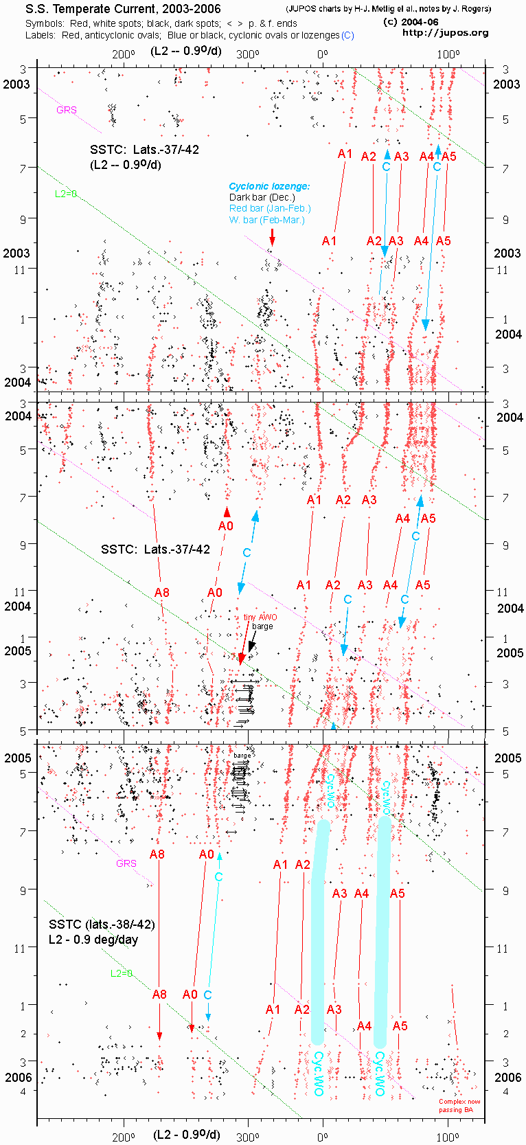 This bulletin reviews the history of the circulations in the S.S. Temperate domain over the last few years. Attached is a composite of JUPOS charts (prepared by Hans-Joerg Mettig and colleagues), and three montages of high-resolution images from 2004, 2005, and 2006, showing these long-lived spots