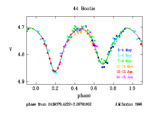 44 Bootis is a triple system, of which the fainter component (B+C) is the nearest example of a W UMa type eclipsing binary. 44 Bootis is also known as i Bootis (not to be confused, as has sometimes been done, with iota Bootis !). Confusion as to the star's identity also seems to extend to the 4th edition of the GCVS, in which the eclipsing component BC carries the label ZZ Boo. However, the GCVS lists two (!) objects with the label ZZ Boo, the other being an EA type binary with a period of 4.99 days. Since it is the latter which occupies its correct position (between YZ and AA) in the catalogue, I assume that 44 Bootis BC acquired the label ZZ in error. The GCVS gives the range of BC as 5.8-6.4; however, observation is hindered by the proximity of the brighter A component, which during this century has never been more than 2.5 arcseconds distant. If the light from A+B+C is measured together -as is usually the case - the total range is only 0.17 magnitudes. (All subsequent references to the light variation in this article will refer to the combined light of the system (A+B+C)).