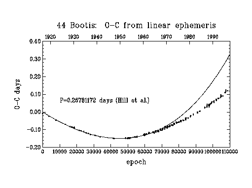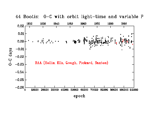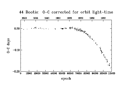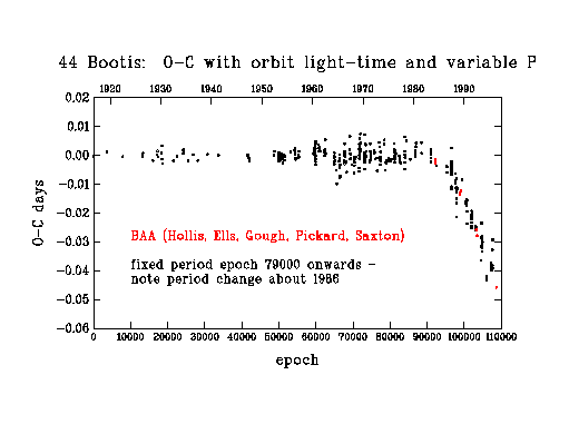 A detailed study of eclipse timings of 44 Bootis was made by Hill et al (1989). They considered astrometric, radial velocity, and eclipse timing observations. Their paper contains a list of over 300 eclipse timings assembled from various sources and dating back to 1916. If the eclipsing component 44 Boo BC were a perfect 'clock' (i.e. had a stable period) then eclipse timings would allow us to study the system in the third dimension (at right angles to the plane of the sky), owing to the varying light travel time as A-BC orbit each other. The visual orbit does yield the inclination, but in order to relate the visual orbit to light travel time, it is necessary to know a scale factor which depends on both the distance to the system (which relates angular measure on the sky to absolute length) and also the position of the barycentre between A and BC (mass ratio (mA+mBC)/mBC). (The masses can actually be derived from the radial velocities and Kepler's laws, which leaves the system parallax (distance) as the unknown). Hill et al were able to estimate this scale factor by finding that a good fit exists between a scaled orbit and the observed eclipse timings from 1916-1965 (this also implies that intrinsic period changes in component BC were small -compared to orbital light-time changes -during this interval). A large intrinsic period change ocurred about 1967. Radial velocity of the barycentre of the system, which is constant, has been ingored: this is justified since our aim is to discover and understand changes in orbital period, both apparent and intrinsic, of component BC.