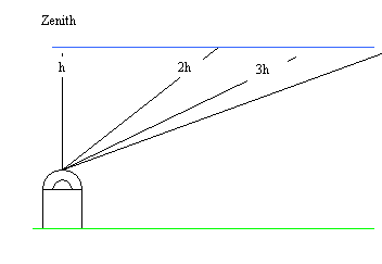 If we call the height of the atmosphere at the zenith 'h' then at Z = 60° the atmospheric distance is 2h. Table 1 below shows how quickly the atmospheric path length increases as one observes more than 60° from the zenith. One degree above the horizon there is 100 times more atmosphere to look through than at the zenith. No wonder that the Sun looks fainter. The path length through the atmosphere is also known as the 'air mass'.