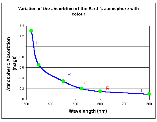 Even if you have never thought about it quantitatively, you cannot fail to be qualitatively aware that the Earth’s atmosphere absorbs light. You know that the daytime sky is blue, that even on apparently cloud free days the Sun or the stars are sometimes brighter than at other times. You also know that when the Sun is low in the sky it appears fainter and redder than when it is high in the sky. All these effects are due to that complex mix of gasses and particles which we call the atmosphere, and without which the Earth would be a lifeless ball of rock. The blue of the daytime sky is due to the fact that many of the molecules which make up the atmosphere have the same size as the wavelength of blue light, about half of one micron. This causes them to scatter the blue light, hence the blue sky, while the longer wavelength of red light, about 0× 7 of a micron, allows it to pass through the atmosphere less effected, hence the red of the setting sun. Note however, that the Sun is not only redder but also much fainter when near the horizon. This is due to the fact that there is much more atmosphere for the light to pass through at low elevations. Light of all colours is being absorbed but the red light is being affected less than the blue light.