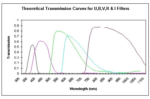 The other four filters have none of these problems. The B, V, R and I filters sit well away from atmospheric cut offs and are well within the sensitivity range of CCDs. The peak of sensitivity of most CCDs lies near to the V and R bands and if you could only afford to use one filter then there would be much to be said for making that the V filter. It approximates to the estimates that have been made by visual observers over centuries and coincides, as near as is possible, to the millions of V band observations taken over the last century. Thus your results can immediately be compared with those of thousands of other observers.