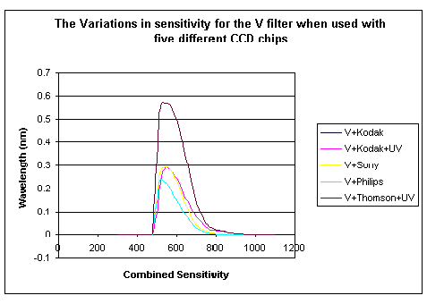 In the figure below we demonstrate some of the variations which occur when one filter, the V filter in this case, is used with a variety of CCD chips. Note that the V filter lies close to the maximum sensitivity of most CCD chips and the effects would be much worse for the U and B filters.