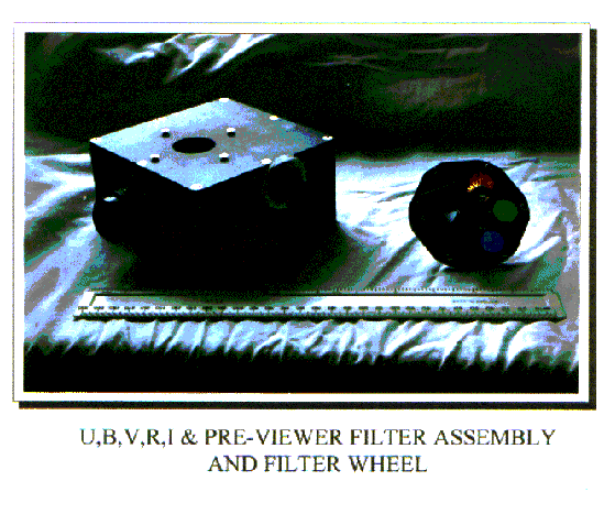 Below we show a photograph of the Stargazer filter and previewer system, designed and developed in England, to give amateur astronomers access to a professional quality system. In this case the indexing of the six position filter wheel is done by a wide, flat area on the circumference of that wheel for every position and it is impossible to measure any departures from perfect indexing. Thus any errors are well within the size range required by small pixels. Note also that a prism giving a 20 mm unvignetted field of view is also included to aid rapid acquisition of the correct field when small area CCDs are used