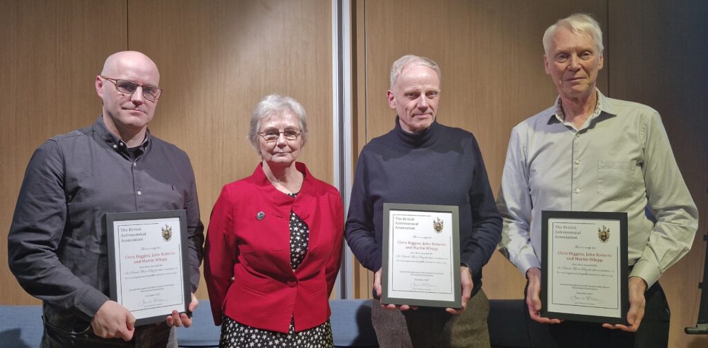 Martin Whipp, John Roberts and Chris Higgins are volunteers at Lime Tree Observatory, North Yorkshire, for the 2025 Prize, in recognition of an exceptional contribution over a number of years to the encouragement of a public interest in astronomy, and of their tireless efforts to inspire the young.