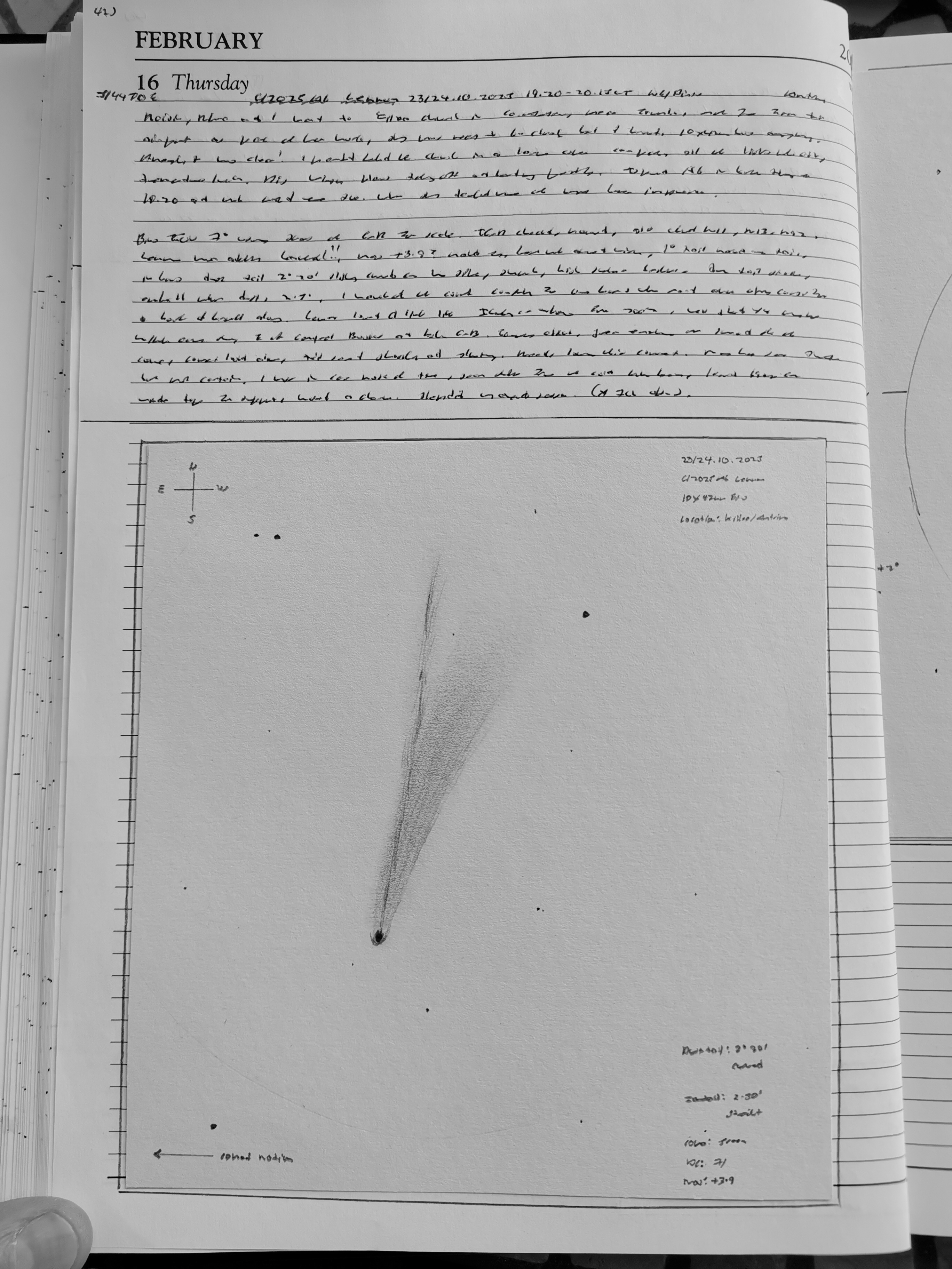 I managed to observe Lemmon for a solid hour without interruption using the binos. In my opinion the comet is a beautiful object and reminds me somewhat of Ikeya-Zhang in 2002. Mag +3.9, DC:7/, dust tail bright, uniform, extending approx 2 degrees 20 arc mins, curved on western side, sharper edge and more straight on east side. Ion tail not detected as far tonight due to the LP, but could see it for 2 degrees 30 arc min's approx, straight, faint, suggestion of streamers. Coma is well condensed, parabolic in shape with a green hood on the sunward facing side. Rapid motion of the comet detected to the east during the session. Comet continues to impress from the perspective of a visual observer. |