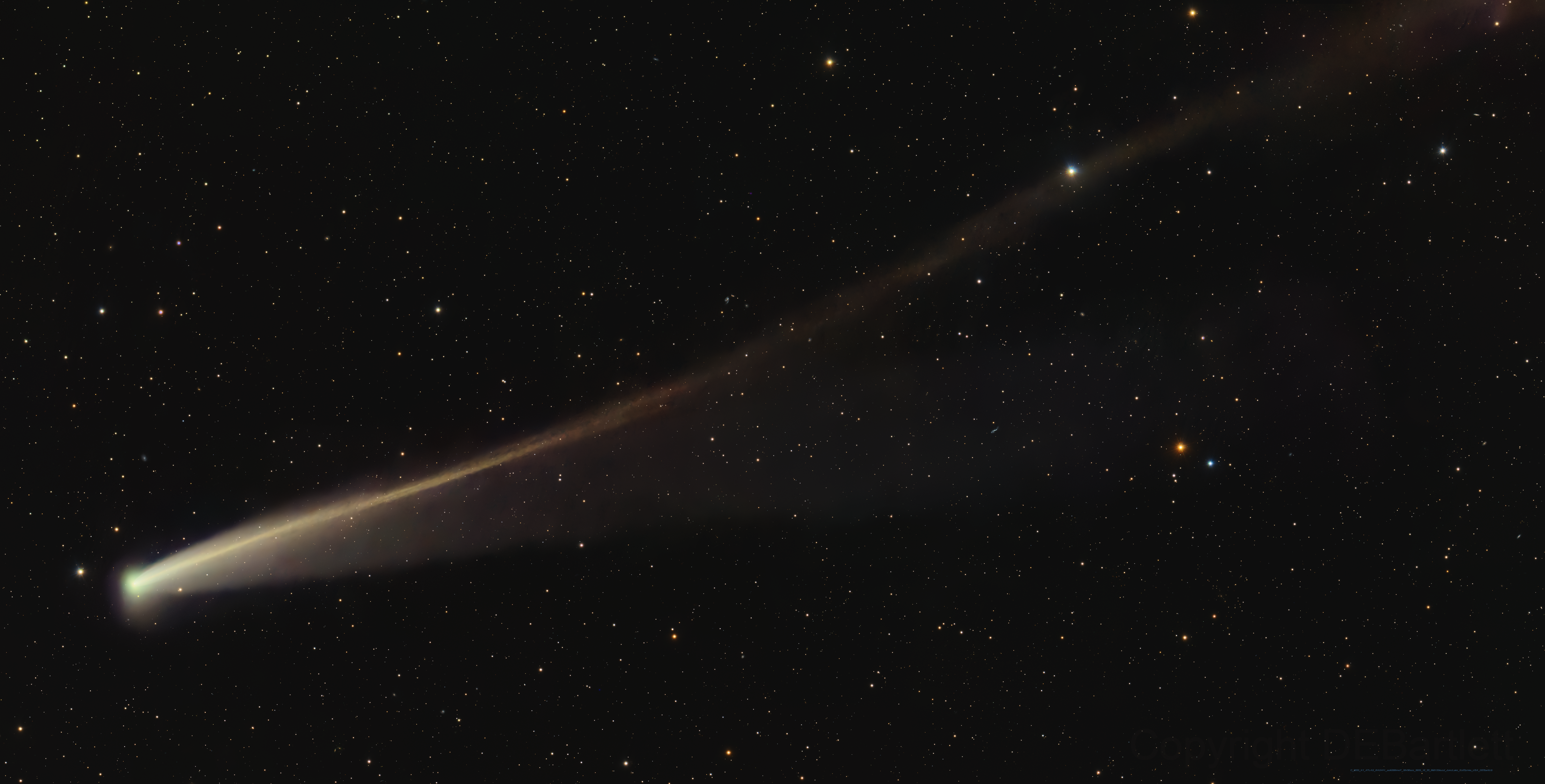 Observational Notes: scope: RASA11 fl620mm F/2 Camera: asi6200mcP Seeing: 3.5/5 Transparency: 7.5/10 Observer: DEBartlett Place: JuneLake California USA (Altitude +2357m) Image Info (widefield BIN2x2), (All images processed solely using PixInsight, Comet Photometry using Tycho-Tracker) Image: 30x90sec Resolution ............... 2.506 arcsec/px Rotation ................. -2.930 deg Field of view ............ 3d 4' 49.2" x 1d 33' 46.6" Image center ............. RA: 11 36 50.112 Dec: +2 39 01.51 |