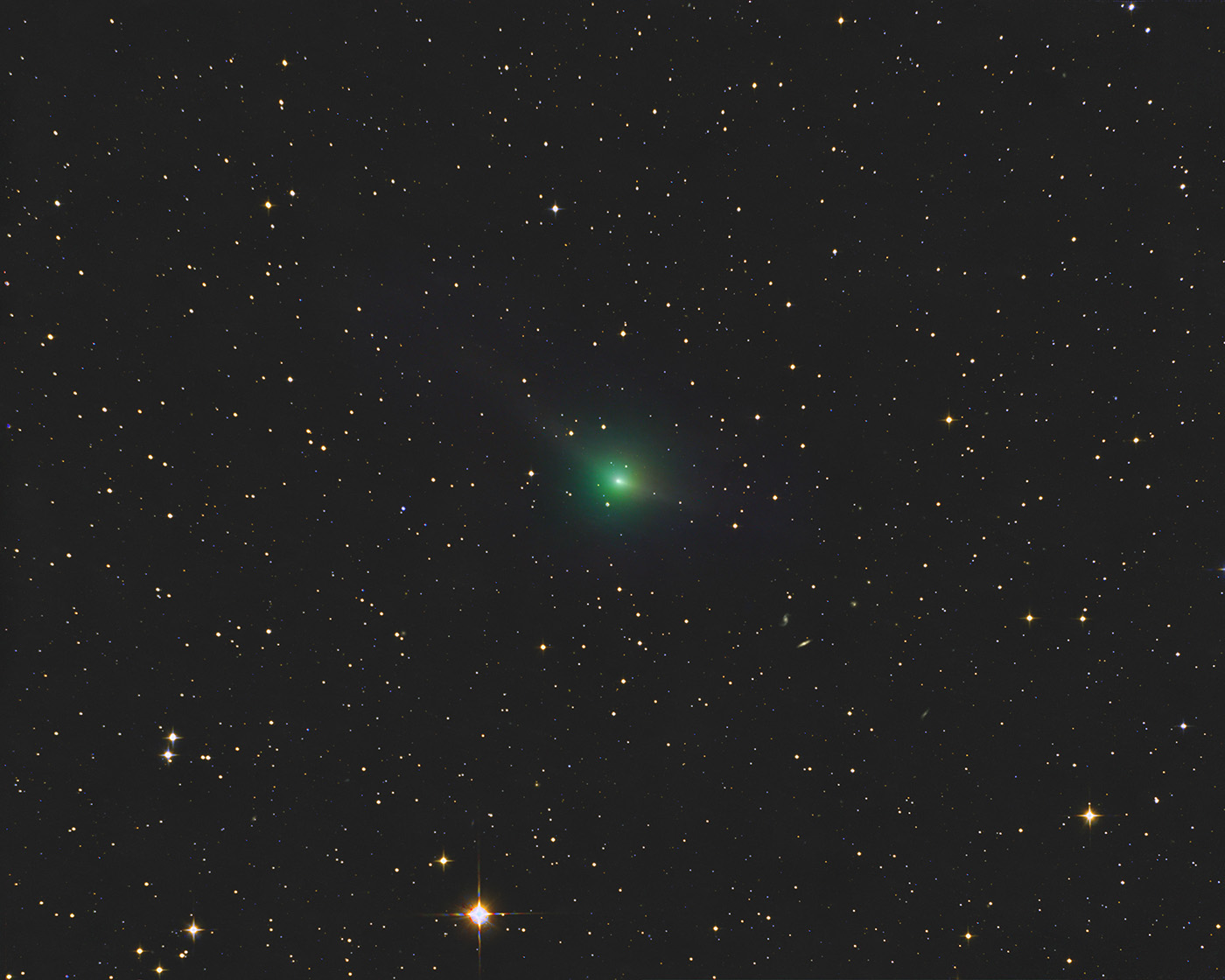 Very near orbital plane crossing, the anti tail points to the lower right here, and the longer more diffuse tail is upper left. -Date/Time Local: 11/14/25 8:00 pm MST -Date/Time UT: 11/15/25 3:00 UT -FOV: 94' x 75' -Orientation: S up -Seeing: 2 -Transparency: 6 -Orig. Scale: 1.2 arcsec/Pixel -Instrument: 10" f/3.8 Newt -Exposure: 60 min total -Camera: Atik 16200 -Location: Payson,AZ |
