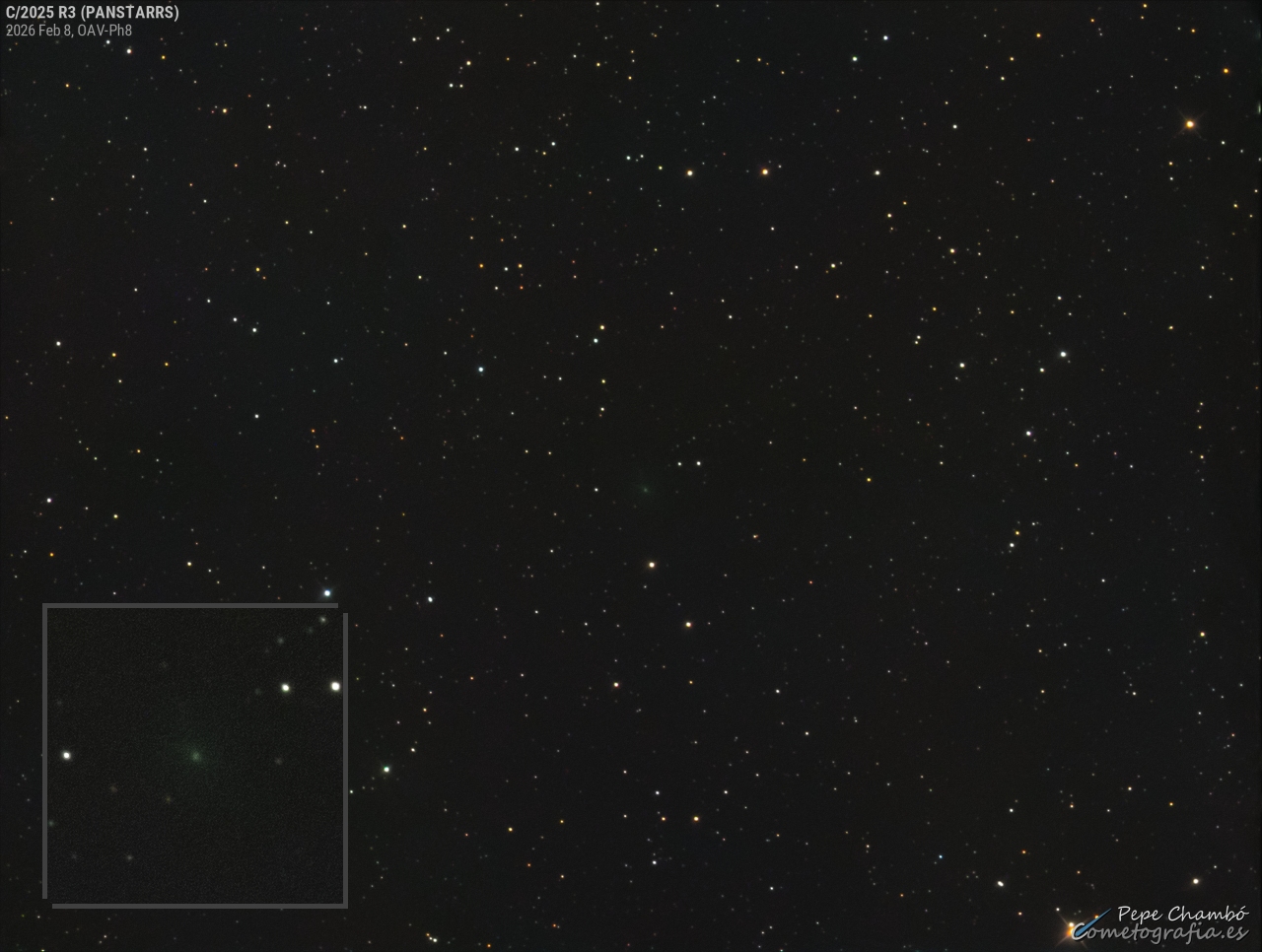 C/2025 R3 (PANSTARRS) @ 2026-Feb-08, 18:36 UT r: 1.527 au, delta: 2.233 au, elong: 35°E, phase: 22°, psAng: 21°, psAMV: 73°, plAng: 21° Total Mag= 12.4 [aperture 124"], Dia.= 2', DC= 3.5, Tail= 2' PA= 29° (Astrometrica+Comphot, Gaia DR2-G) TS-Photon 8" f/4, Atik 383L+. 15x30s, FOV=78x59', N:Up E:Left. OAV, Valencia (Spain). J.J. Chambó |