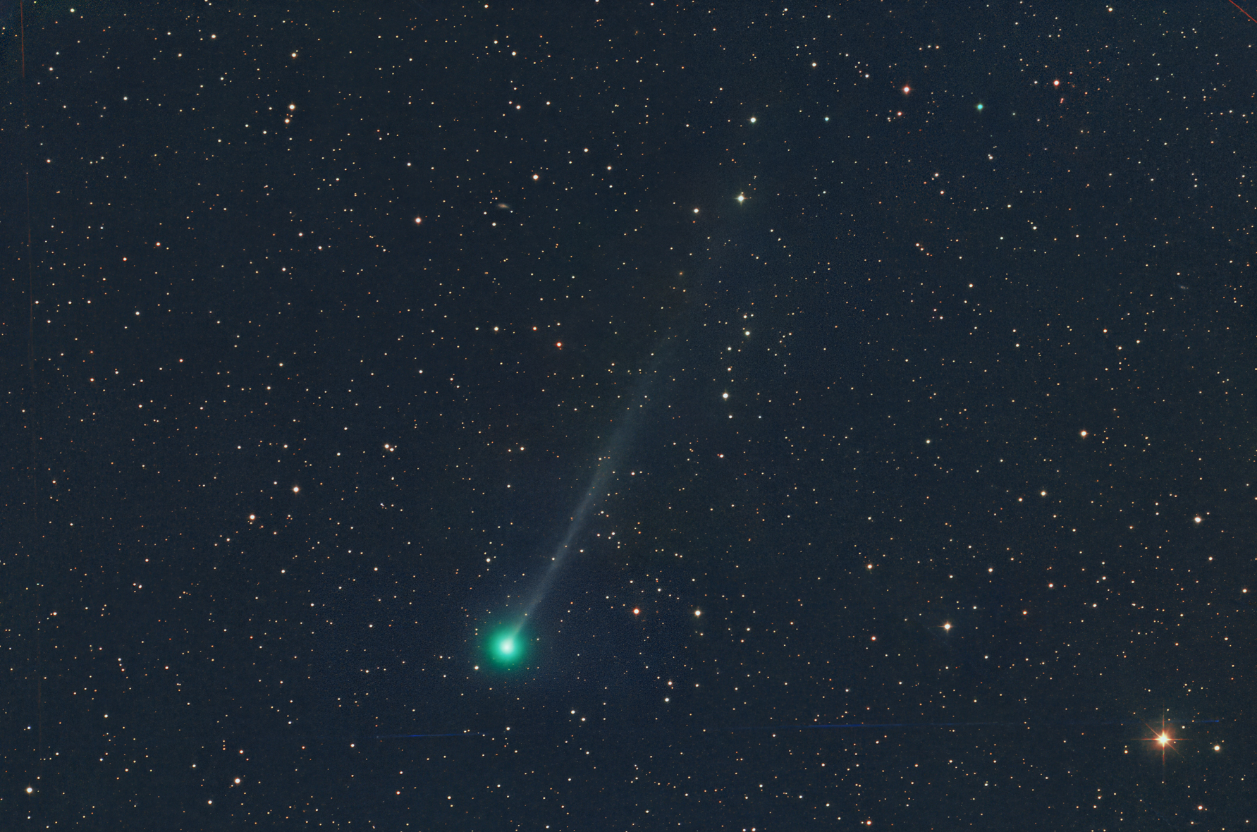 C/2025 R3 Panstarrs 2025 march 14 3.45 UT LRGB 15min 12"/4 QHY 600 9m0 coma 6' tail 45' pa 334 Michael Jäger, Gerald Rhemann Center (RA, Dec): (337.129, 18.568) Center (RA, hms): 22h 28m 31.016s Center (Dec, dms): +18° 34' 06.298" Size: 58.6 x 35.5 arcmin Radius: 0.571 deg Pixel scale: 1.78 arcsec/pixel "Orientation", may be incorrect, use at your own risk: Up is 0.0 degrees E of N |