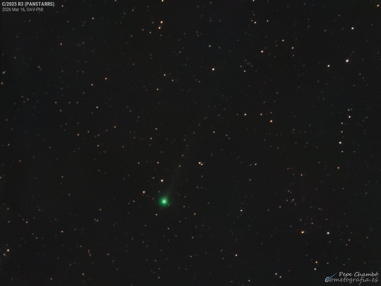 C/2025 R3 (PANSTARRS) @ 2026-Mar-16, 05:08 UT Total Mag= 8.1 [aperture 180"], Dia.= 3.5', DC= 6.5, Tail= 25' PA= 336° (Astrometrica+Comphot, Gaia DR2-G) TS-Photon 8" f/4, Atik 383L+. L=9x60s RGB=1x60s, FOV=67x50'(crop), N:Up E:Left. OAV, Valencia (Spain). J. Chambó |