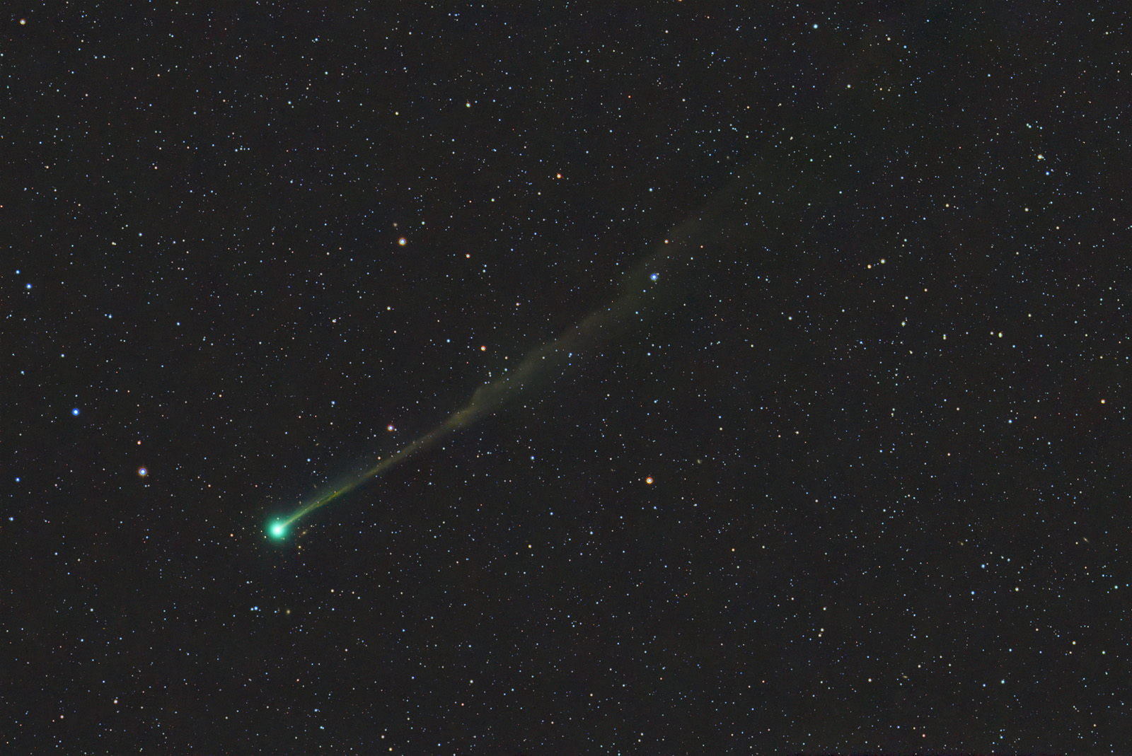 -Comet: C/2025 R3 Panstarrs -Date/Time Local: 3/26/26 4:46am MST -Date/Time UT: 3/26/26 11:46 UT -FOV: 3 x 2 degrees -Orientation: N Sun up -Seeing:2 -Transparency: 3 -Orig. Scale: 1.9 arcsec/Pixel -Instrument: RASA 8 f/2 -Exposure: 20 min total -Camera: ASI2600MC -Location: Payson,AZ the comet is much higher in the morning sky, about 15 degrees during best imaging. Tail has possibly 3 disconnection events occurring, and is quite curved. Some color in the tail, primarily greens and yellows. |