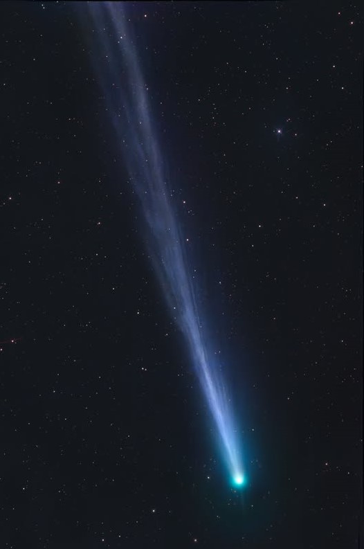 A hint of an anti-tail can be detected in this image Comet C/2025 R3 Panstarrs Date: 15 04 2026 UT 03:46 Location: Farm Tivoli, Namibia Telescope: ASA Astrograph 12" f3.6 Camera: ZWO ASI 6200 MM Pro Mount: ASA DDM 85 Exp.Time: LRGB 120/120/120/120 sec. Gerald Rhemann, Michael Jäger Center (RA, Dec): (353.310, 19.104) Center (RA, hms): 23h 33m 14.334s Center (Dec, dms): +19° 06' 15.762" Size: 1.26 x 1.9 deg Radius: 1.142 deg Pixel scale: 8.64 arcsec/pixel "Orientation", may be incorrect, use at your own risk: Up is 268.5 degrees E of N |