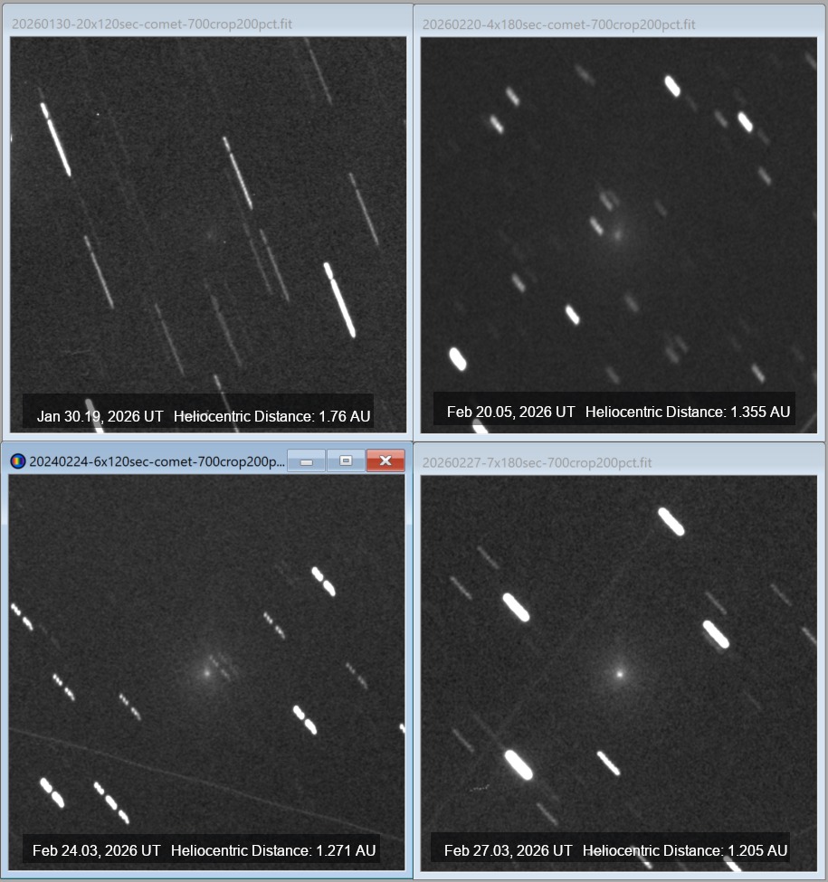 The rapid brightening of Comet C/2026 A1 (MAPS) from approximately mag 17 to 12 is clearly visible in this montage of 4 evenings (Jan 30,Feb 20, 24 a 27). All images have been linear stretched by an identical amount to allow direct comparison. Scale is also identical (10' x 10' for each image) and the Telescope is identical (25cm f3.8 corrected Newtonian at site X07 in Chile). The UT dates and distance of the comet from the sun are shown on each pane |
