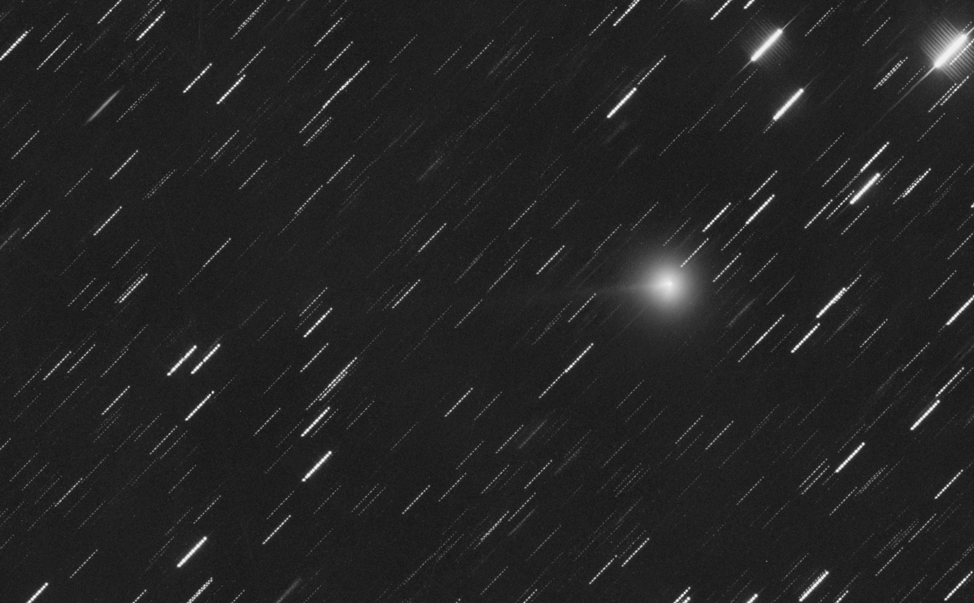 C/2026 A1 (MAPS) 2026-03-11 18.30 UT 15x120sec (UV/IR+G) 12"/3.6 ASA Astrograph Asi 6200 10m3 coma 9' (bright inner c. 5,5') tail 22' pa 94 Gerald Rhemann, Michael Jäger, Farm Tivoli Namibia Center (RA, Dec): (37.634, -11.591) Center (RA, hms): 02h 30m 32.217s Center (Dec, dms): -11° 35' 26.037" Size: 56.1 x 34.8 arcmin Radius: 0.550 deg Pixel scale: 1.77 arcsec/pixel "Orientation", may be incorrect, use at your own risk: Up is 358.5 degrees E of N |