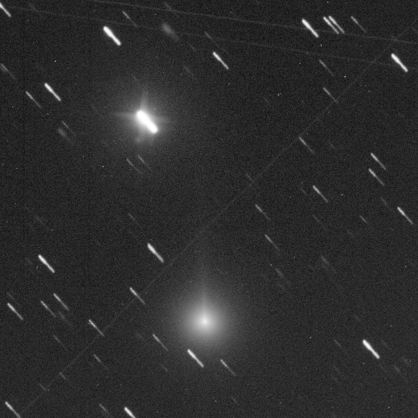 C/2026 A1 (MAPS) : March 14.40 UT, 2026. Image acquired remotely using the 0.51m f6.8 Corrected Dall-Kirkham Astrograph at iTelescopes's Siding Spring facility, NSW, Australia. 4 x 180 sec green filtered and 3 x 180sec clear filtered exposures were stacked and the final image shown here is cropped to 15 x 15'. Using the green filter exposures the total magnitude was estimated as 10.2 with a coma of 6'. The ion tail as seen here extends in PA 95 degrees for perhaps 10' or even more. Center (RA, Dec): (36.202, -10.153) Center (RA, hms): 02h 24m 48.390s Center (Dec, dms): -10° 09' 09.366" Size: 15 x 15 arcmin Radius: 0.177 deg Pixel scale: 1.08 arcsec/pixel "Orientation", may be incorrect, use at your own risk: Up is 265.3 degrees E of N |