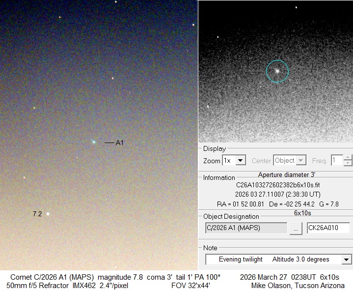 The comet has brightened to magnitude 7.8 on March 27 with only a stub of a tail visible in the evening twilight at an altitude of 3 degrees. March 26 the comet was magnitude 7.9 with a 2' tail at PA 100 degrees in evening twilight at an altitude of 3.1 degrees. |