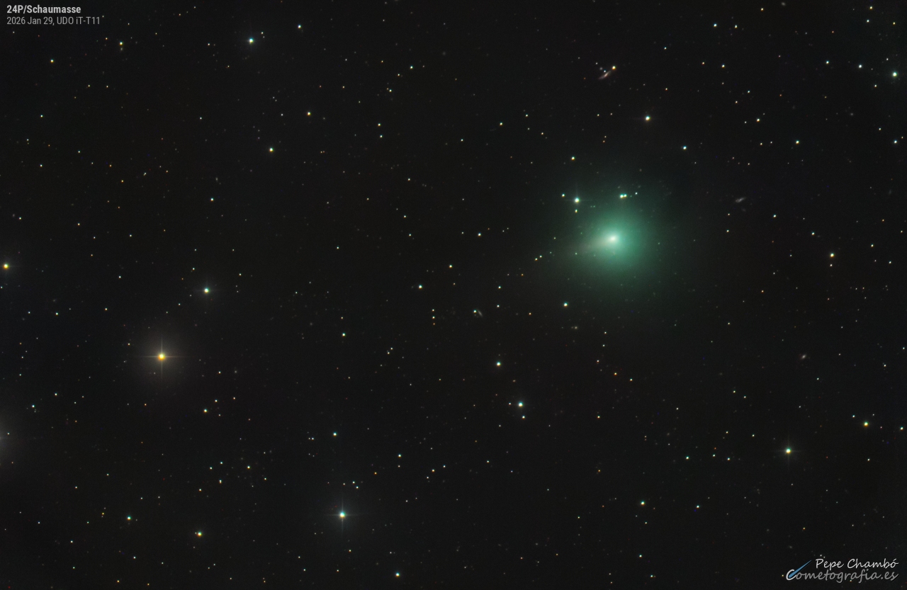 24P/Schaumasse @ 2026-Jan-29, 13:10 UT r: 1.217 au, delta: 0.614 au, elong: 96°W, phase: 54°, psAng: 287°, psAMV: 322°, plAng: -14° Total Mag= 9.1 [aperture 564"], Dia.= 12', DC= 3.5, Tail= 2.5' PA= 285° (Astrometrica+Comphot, Gaia DR2-G) Planewave 20" CDK f/4.5, FLI PL11002M. 8x180s, FOV=54x36', N: E:. UDO, Utah (USA). J.J. Chambó, cometografia.es |