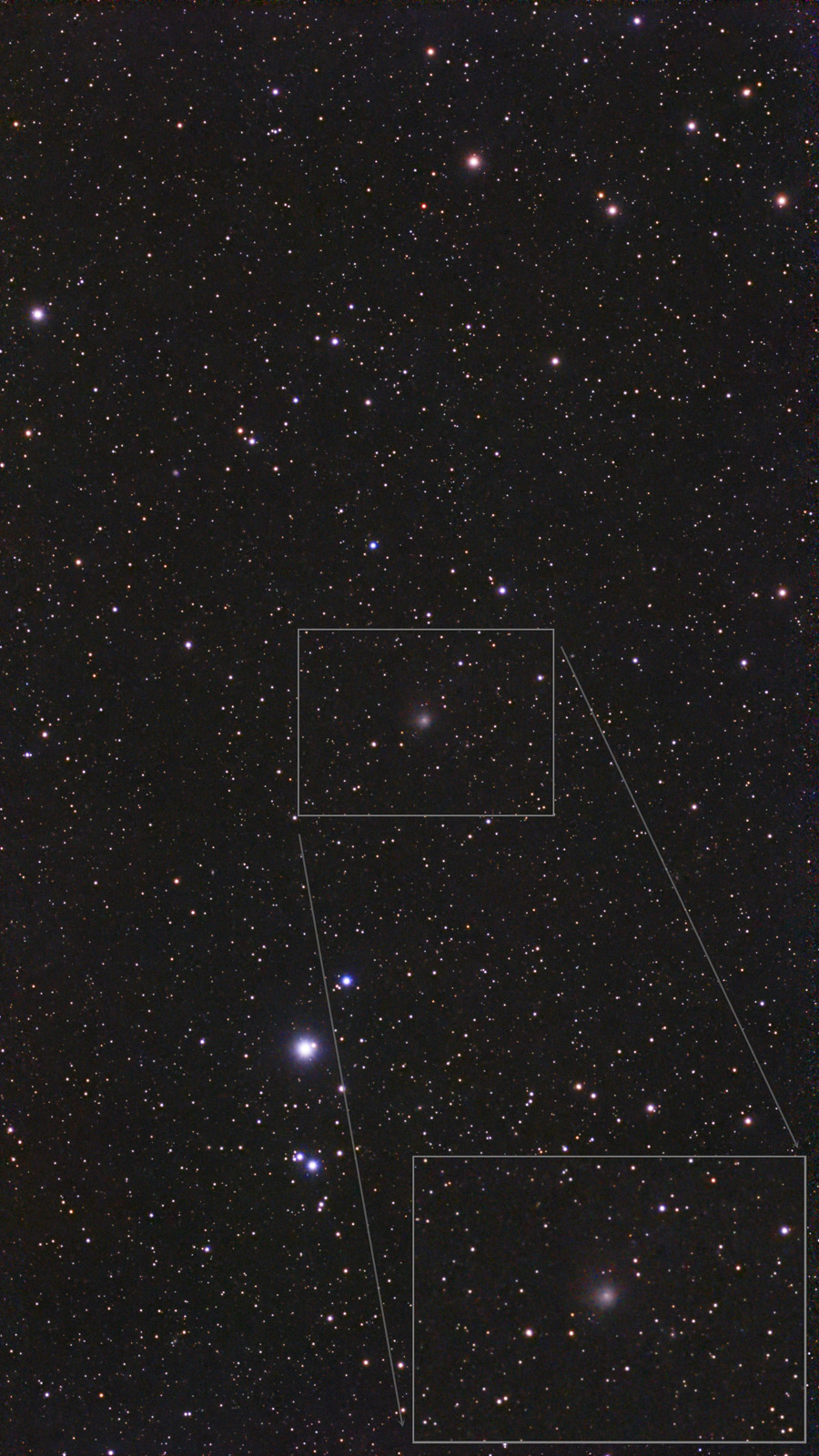 Comet: 29P Schwassmann-Wachmann 1 -Date/Time Local: 3/13/26 12:34 am MST -Date/Time UT: 3/13/26 7:34 UT -FOV: 2.2 x 3.9 -Scale: 8.8 arcsec/pixel (resized value) -Seeing: 4 -Transparency: 4 -Instrument: Sigma 150mm f/4 Survey Astrograph -Exposure: 24 min total -Camera: ASI585MC -Location: Payson, AZ |