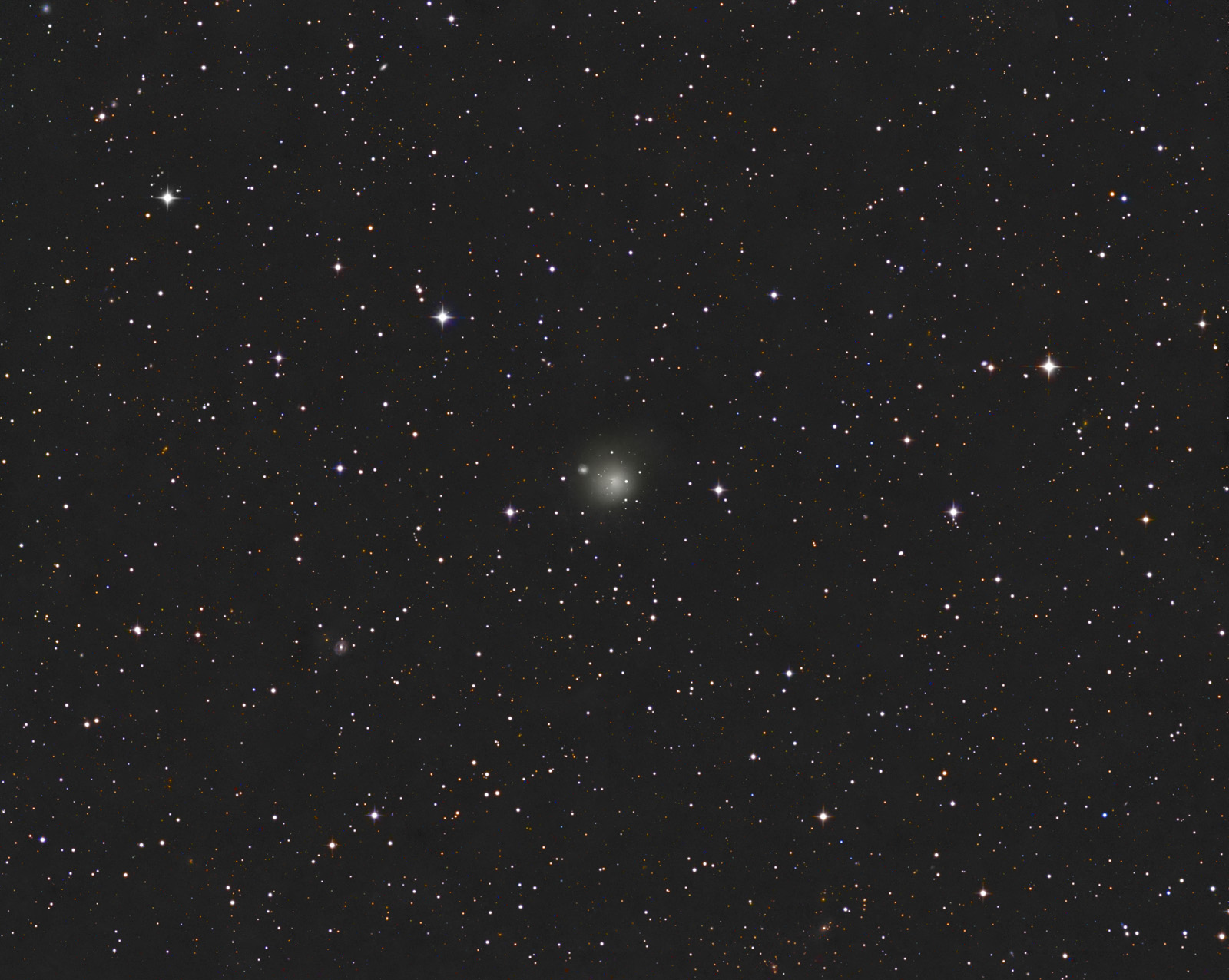 Comet: C/29p SW -Date/Time Local: 3/17/26 12:03 am MST -Date/Time UT: 3/17/26 19:03 UT -FOV: 94' x 75' -Orientation: N up -Seeing: 2 -Transparency: 6 -Orig. Scale: 1.2 arcsec/Pixel -Instrument: 10" f/3.8 Newt -Exposure: LRGB = 3h total -Camera: Atik 16200 -Location: Payson,AZ You can see an extended fan of material coming from the circular coma. |