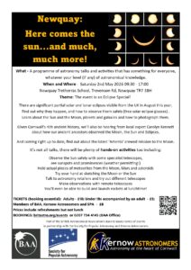 Given Cornwall’s rich ancient history, we’ll also be hearing from local expert Carolyn Kennett about how our ancient ancestors observed the Moon, the Sun and Eclipses.