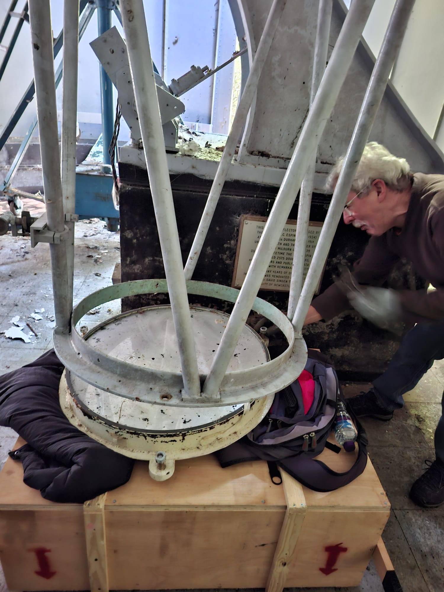 I am a member of the Espin Telescope Recovery Group – John Nichol, Caroline Sinden-Fuller and Denis Buczynski are also members. We have been working closely with Close House staff to recover the telescope and its optics. Yesterday, 25th September, we visited the site and were able to remove both the primary and the secondary mirrors. Both are now in the safe hands of John Nichol, ready for any remedial work.