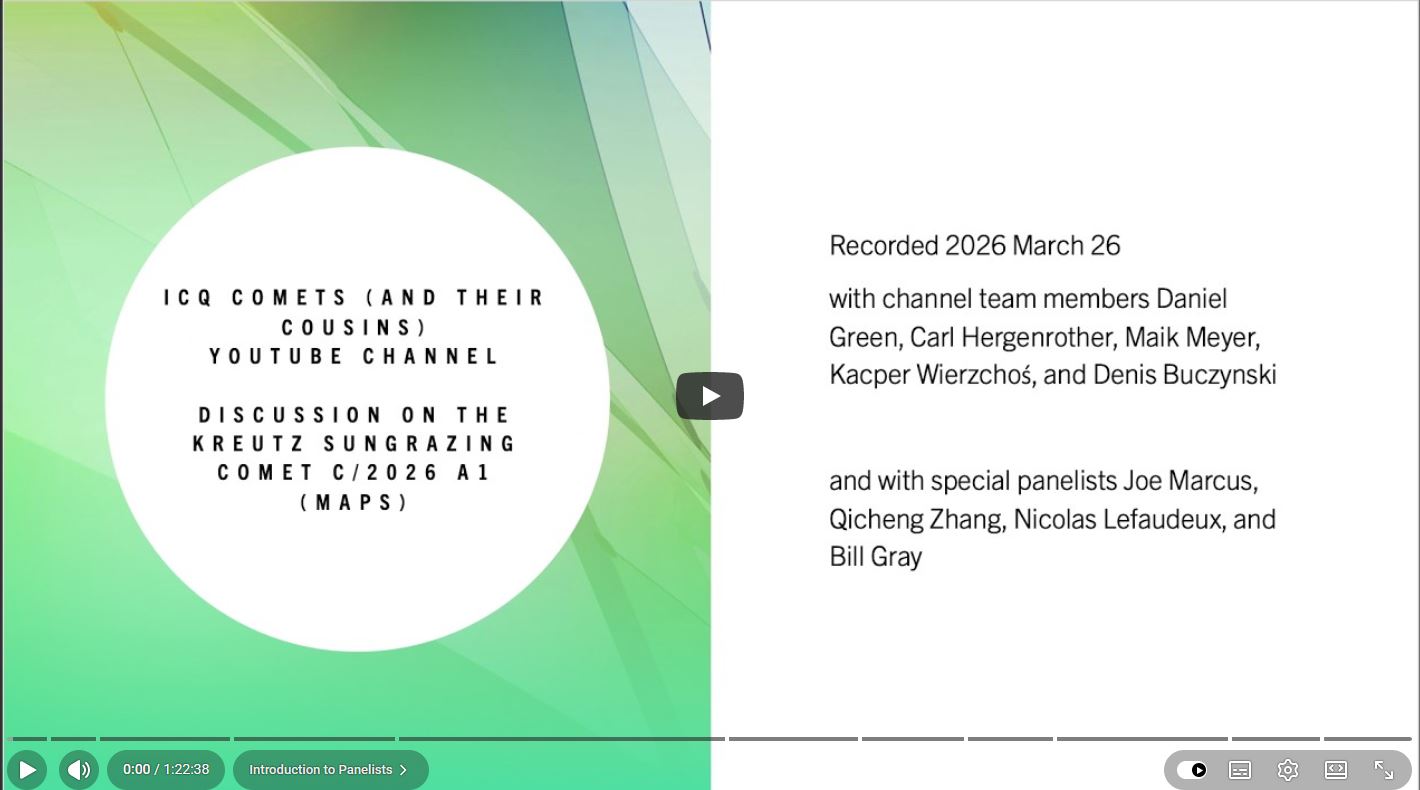 Latest ICQ VIDEO ON UTUBE ABOUT C/2026A1 MAPS › Forums › Comets › Latest ICQ VIDEO ON UTUBE ABOUT C/2026A1 MAPS This topic has 0 replies, 1 voice, and was last updated 3 hours, 1 minute ago by Denis Buczynski. Viewing 1 post (of 1 total) Author Posts 31 March 2026 at 11:37 am #636816 Denis BuczynskiParticipant Hello all, Here is a link to the lastest ICQ video on UTUBE. A discussion about the Kreutz Sungrazing comet C/2026A1 MAPS due at perihelion in the next few days.. https://www.youtube.com/watch?v=Inwh5fxk7X0 Denis Buczynski Attachments:icq.jpg Author Posts Viewing 1 post (of 1 total) You must be logged in to reply to this topic. Log In Username: Password: Keep me signed in Connect with :Login with Sheep CRM Log In
