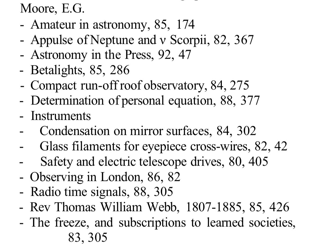 There’s an E G Moore active in the BAA around this time, the attached image is from the second half-century Journal index. He also contributed to The Astronomer where his address was: 44 Nelson Road, Rayleigh, Essex. By the time his final Journal contribution was published (vol 92, p.47) in 1981 he had moved to 1 Hillside Villas, Station Road, Pluckley, Kent.