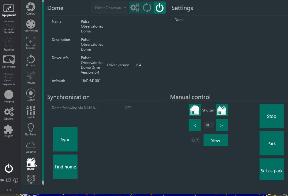 I have grasped the nettle of “dome automation” I have a 2.7m Pulsar and EQ8 mount inside. I have installed the Pulsar ASCOM driver. All good so far except ASCOM platform is V6, not V7 (hopefully no matter). I have configured the dome, and NINA keys can move the dome. The question arises from an on-screen indicator that says:
