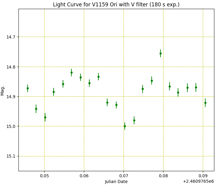 Here’s a run I did on V1159 Ori the night before last from my C11 in Spain (2025-10-27). Interesting short term variability. The SNR of the target star was around 100. The average V mag was 14.89 over the 21 frames.