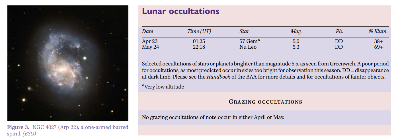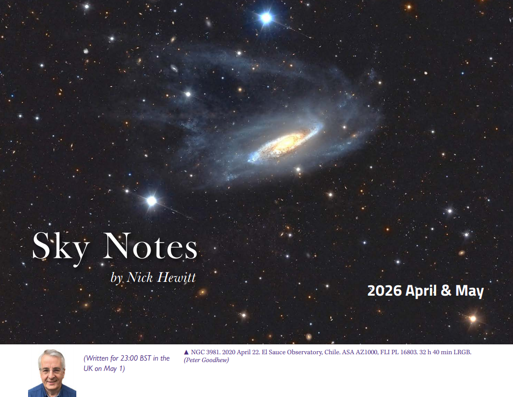 April still has acceptably long nights, and they tend to be warmer than earlier in the year. By May, however, the ‘silly season’ is well underway. More comfortable observing must then be balanced against the prospect of a shortened night’s rest. To add insult to injury, the Solar System is proving awkward to nigh impossible for observers, with only Venus and Jupiter offering much to enjoy.