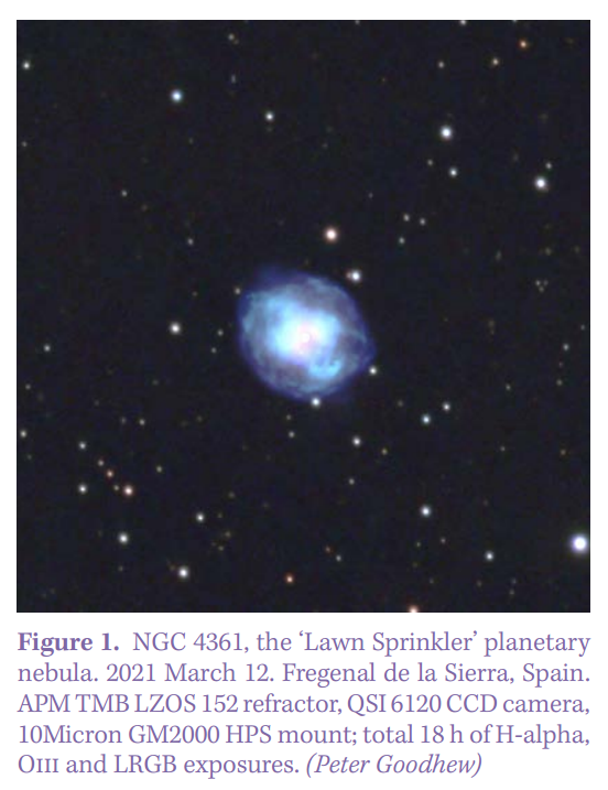 NGC 4361 is sometimes known as the ‘Lawn Sprinkler’ planetary (Figure 1). It can be overlooked amid the rich galaxy fields of spring, but it is well worth seeking out as it is both reasonably large and fairly bright. Its round disc, measuring 1.9 × 1.9 arcmin, shines at magnitude 10 (V) and lies within the keystone of central Corvus. It forms a triangle with delta and gamma Corvi and could easily be mistaken for a galaxy, as two curved extensions within a faint halo may resemble spiral arms surrounding a bright core. This ‘core’ is in fact the 13th-magnitude central star. William Herschel discovered the nebula in 1785 but did not place it in his planetary nebula class (IV). No colour is seen.