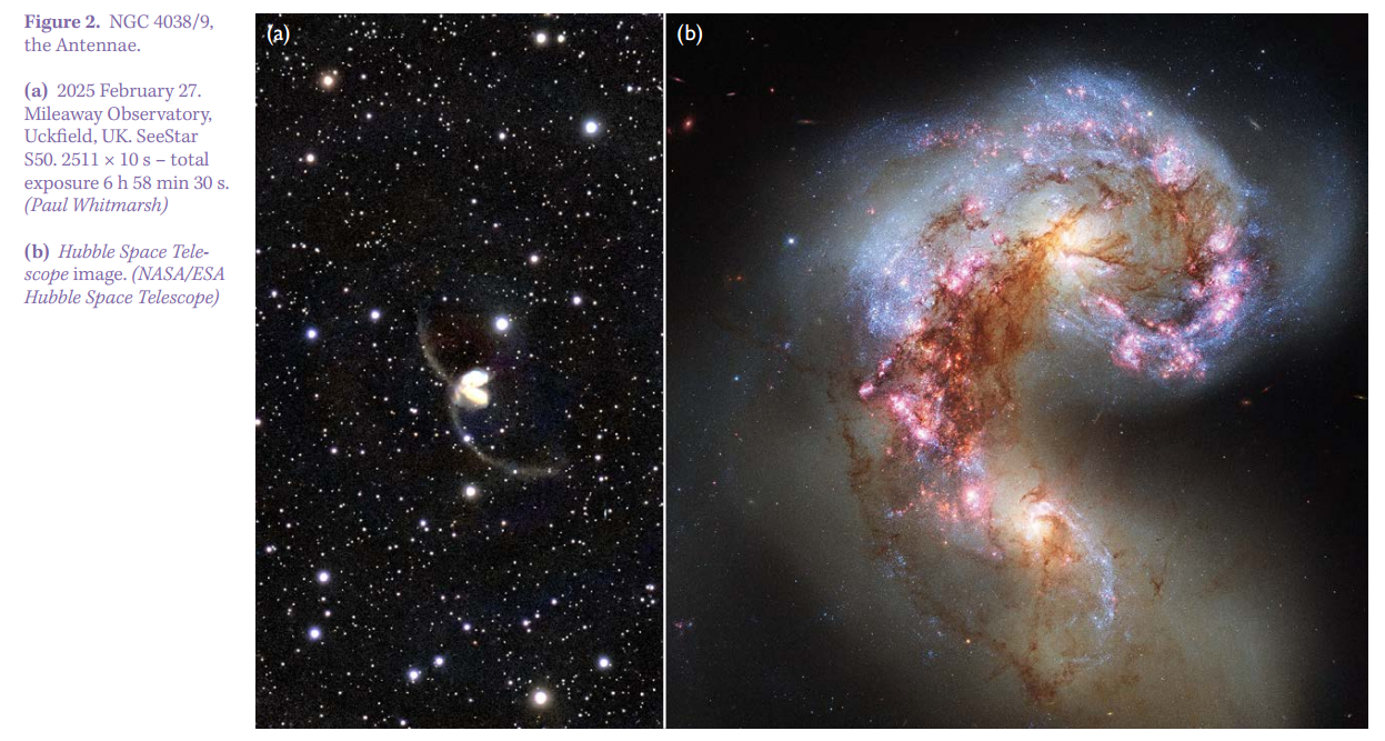 The Antennae (NGC 4038/9; Figures 2a & 2b) are among the finest examples of interacting galaxies in the heavens, undergoing extraordinary starburst activity as a result. Located west of Corvus’ trapezoid and forming a triangle with gamma (Gienah) and epsilon Corvi, they are around 10th magnitude. In telescopes with adequate aperture, they appear as an irregular mass with a hollow toward the southwest. NGC 4038 is marginally brighter and larger than NGC 4039 and has bright knots in its periphery, the starburst activity being spectacular on detailed images. The two tidal streams that give the pair their nickname have been ejected during the interaction and consist of gas and stars.