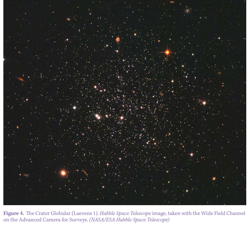 Crater does contain one of the Milky Way’s more recent discoveries: a globular cluster, Laevens 1 (Figure 4), known as the ‘Crater Globular’. It was discovered only in 2014 by the VST ATLAS Survey – a wide-field optical survey carried out with the VLT Survey Telescope in Chile. It is relatively young by globular-cluster standards, perhaps about 7.5 billion years old, and only about 10,000 solar masses. It remains under study and could yet prove to be a dwarf galaxy, as it is very distant at 470,000 light-years. Being extremely faint, it is unlikely to interest the amateur observer.