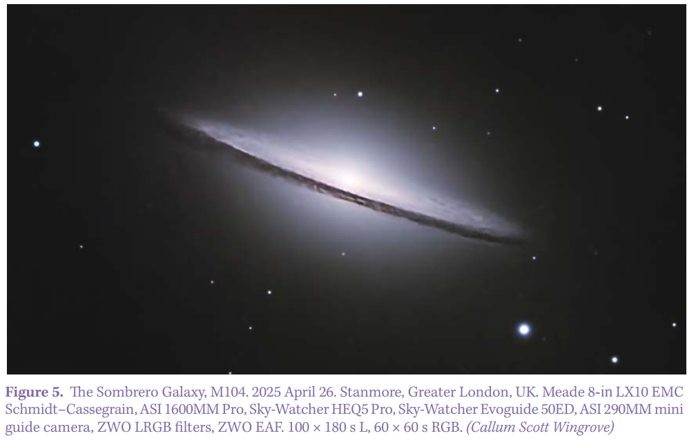 Southern Virgo straddles Corvus and is stuffed with NGC galaxies, but the best in the vicinity is Messier 104, the Sombrero Galaxy (Figure 5), lying 11.5 degrees west and slightly north of first-magnitude alpha Virginis (Spica). At 8th magnitude it is bright, and identification is helped by a stubby arrow of 7th- and 8th-magnitude stars pointing the way. It is unusual in many ways. Its thin but obvious dust lane is about 2,500 light-years thick and traverses a bright, prominent bulge that conceals one of the most massive black holes in our galactic neighbourhood, estimated at one billion solar masses, at a distance of 30 million light-years. Even now its classification is unclear; most recently, it has been suggested that the galaxy may be in transition from spiral to elliptical.