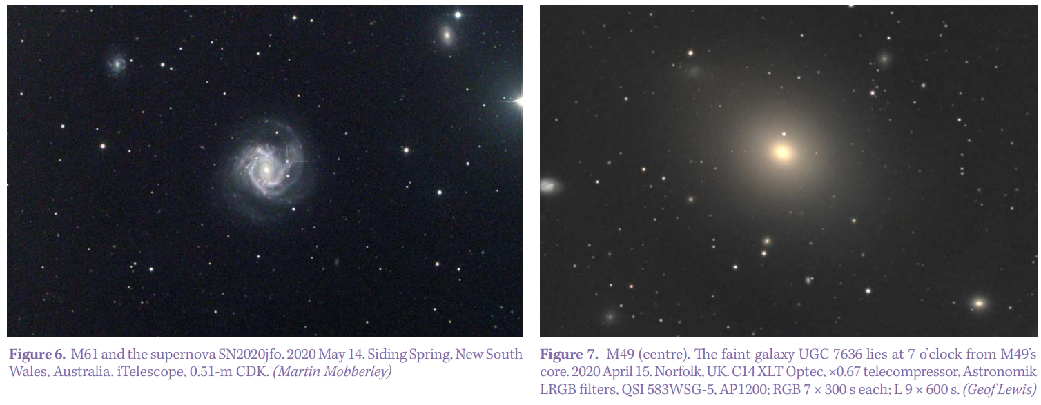 About 3 degrees northeast of M61 lies M49 (Figure 7), an elliptical galaxy often regarded as visually dull and hence ignored. Yet here we enter a richer field, with many fainter galaxies swarming around this 8th-magnitude dominant beast, the second most massive in the Virgo Cluster after M87 and regarded as the southern centre of the cluster. It was the first of the Virgo Cluster galaxies to be observed when Messier spied it on 1771 February 19. M49 may be in the process of absorbing the very faint galaxy UGC 7636 to its southeast. A tidal tail associated with this interaction was discovered in 1994, leading to M49’s inclusion in Arp’s catalogue as Arp 124. Even so, the interaction is a pale shadow of the drama seen in the Antennae!