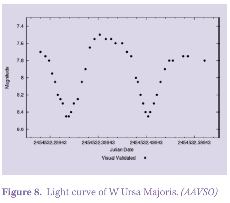 If you become weary of galaxies, remember that the BAA’s Variable Star of the Year is well placed high in the east by April in Ursa Major: W Ursa Majoris. This extraordinary star is easy to find, preceding the Pointers, Dubhe and Merak. Small telescopes or large binoculars will reveal the 7.9-magnitude star and allow you to follow its continual change in brightness over its 8-h period (Figure 8). This very short-period eclipsing binary has both components in contact! See the BAA Handbook 2026 pp. 106–7 for more details.