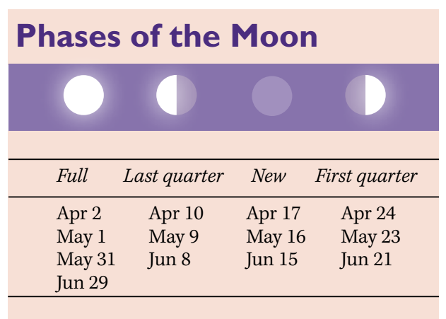 The Eta Aquariids are the best meteor shower of this period, with maximum activity between May 5–7. These meteors originate from debris left by comet 1/P Halley and form the spring equivalent of the autumnal Orionids. The shower is best seen an hour before morning twilight, but the low Moon in Sagittarius, in a waning gibbous phase, compromises the display.