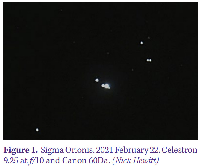 Sigma Orionis (Figure 1) is an easily separated multiple star system, with a combined magnitude of 3.8. It lies below Alnitak (zeta Orionis, the eastern stellar component of the Orion’s belt) and to the west of the Horsehead Nebula. Four of its stars can be resolved, ranging from 4th to 8th magnitude, and are stunning. These are hot O-, B- and A-type stars, with the brightest, sigma1 Orionis, forming a tight binary separated by 0.25 arcsec.