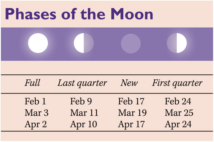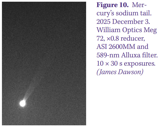 Mercury makes an appearance low in the southwest after sunset in February, reaching eastern elongation on February 19. This will be its best evening showing of the year and offers another opportunity to capture the elusive sodium tail (Figure 10). Although still just visible in early March, it will be very low to the right of Venus and, at magnitude 2, a tough target. Mercury reaches inferior conjunction on February 7; as it passes north of the Sun, great care is needed if attempting observations around this time. On February 19, a very slender crescent Moon lies northeast of Mercury, with Saturn positioned to the east of the Moon.