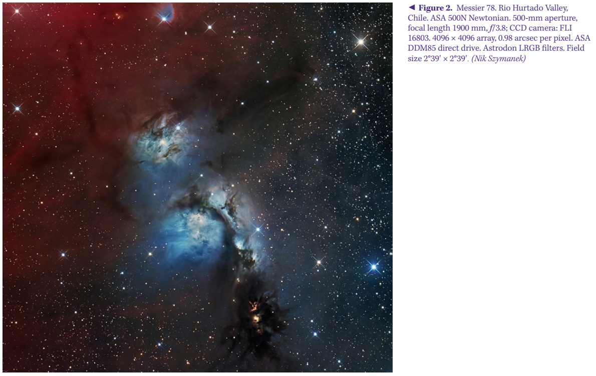 Messier 78 (Figure 2) is the third and final entry within Orion from Messier’s famous catalogue. A reflection nebula set in a dusty environment, it has an intriguing variable component to its south, best known as McNeil’s Nebula, after Jay McNeil who discovered it in 2004. M78 lies northeast of Alnitak and, at magnitude 8, is one of the easier reflection nebulae to observe, especially as it reflects the light of two O-type stars. These are the visible members of a very young cluster containing several T-Tauri-like young stellar objects revealed in infrared studies. McNeil’s Nebula itself was revealed following an outburst by the FU Orionis star V1647 Orionis (see below), but by 2018 it had disappeared, a phenomenon noted by BAA member Mike Harlow, who communicated it to professional astronomers. The area remains worth monitoring for any potential reappearance.