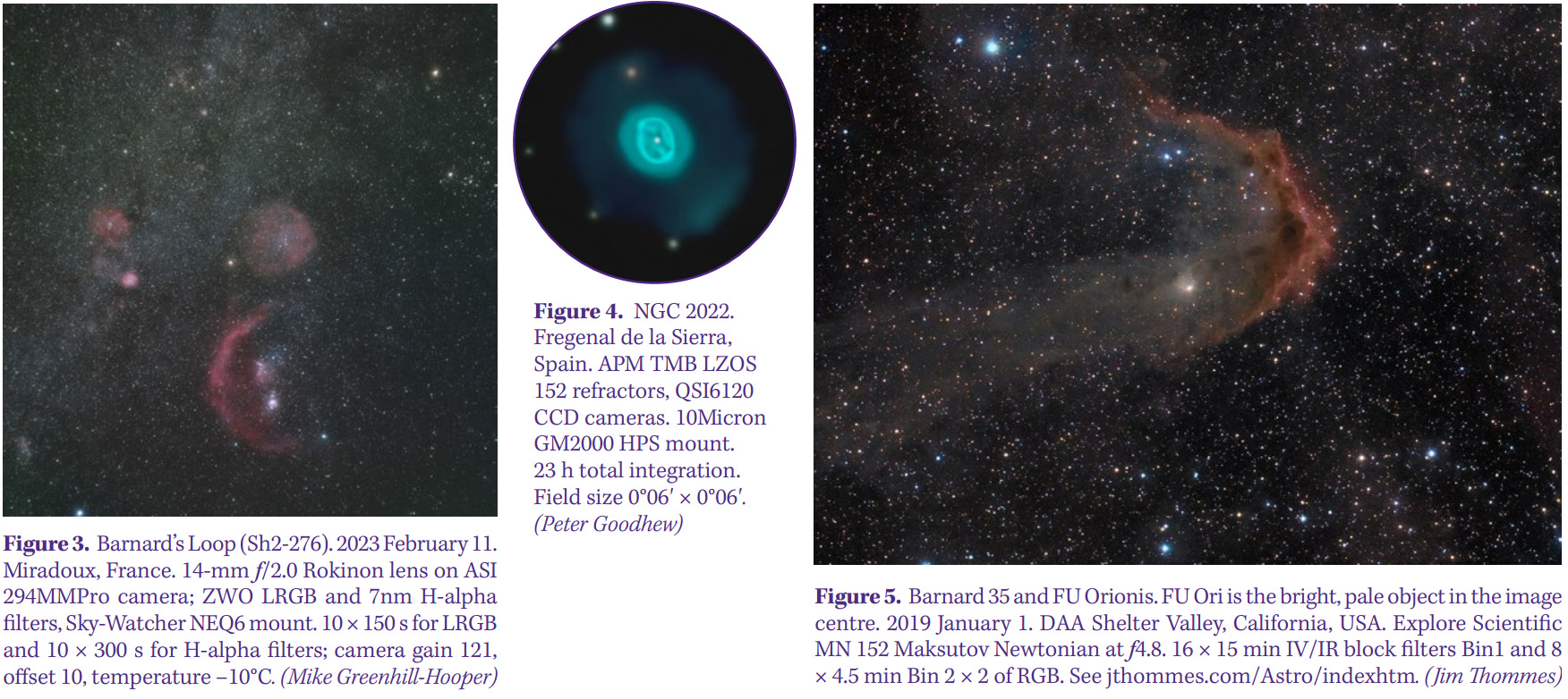 Less than a degree to the east of NGC 2022 is the dark nebula Barnard 35 and the fascinating variable star FU Orionis (Figure 5), which appear poised to be engulfed by Lynds Bright Nebula 878 (LBN 878). FU Orionis is a young star that erupted from obscurity to reach 9th magnitude in 1939; retrospective examination of earlier photographs shows it at magnitude 16. Unlike a classic nova, it has remained around magnitude 9 (V) ever since, confirming that it is not a nova. Much studied, FU Orionis is now known to be a binary star, variable in brightness as many pre-main- sequence stars are, and similar to a T Tauri star. Its activity is associated with Barnard 35, which has become more prominent as the system flared. Each component has an accretion disc, and material falling onto the stars results in the observed brightening. Like many young stellar objects, a small reflection nebula is also present, as seen in Jim Thommes’ image (Figure 5).
