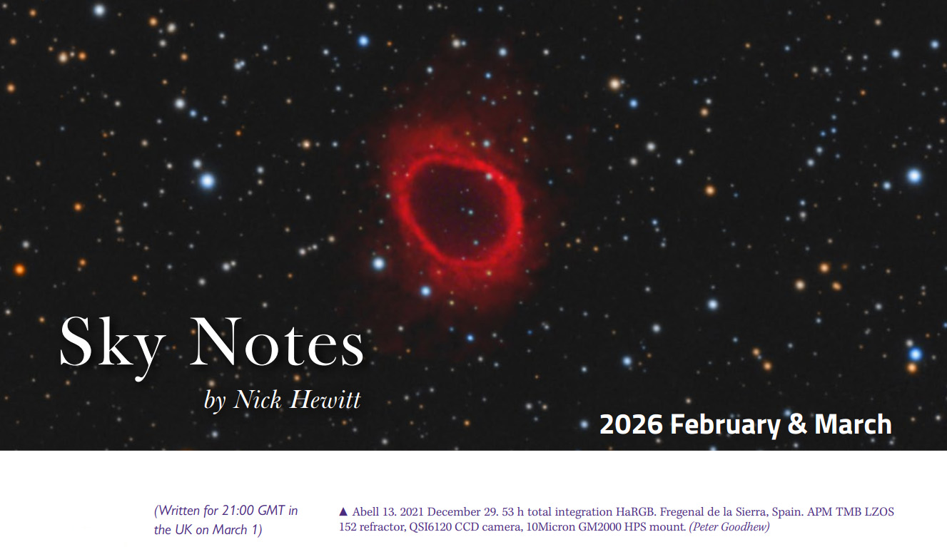 While Orion has dominated the season, and indeed these Sky Notes, Ursa Major is now prowling into the northeast and beginning to swing around its smaller companion, Ursa Minor. If the Hunter is packed with nebulae and clusters, the Great Bear is a paradise for galaxy hunters and becomes increasingly prominent through March and April. Some of late winter’s finest galaxies are on show, with Messiers 81, 82, 101, 108 and 109 being perennial favourites, along with the large, old planetary nebula Messier 97, the Owl. All remain well placed into April and May, so there is no need to rush!