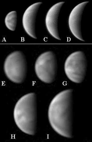 Photo: Ultraviolet CCD images at the E. elongation 2004, by observers in Europe: J. Cooper (UK) with 178mm Mak-Newt., ATK-1HS and Schuler UV 365nm filter (top row, A-D); C. Pellier (France) with 355mm Schmidt-Cass., ATK-1HS and Schuler UV 365nm filter (bottom two rows, E-I)