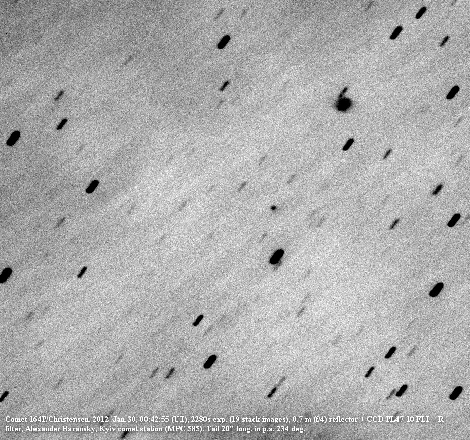 BAACG 20120130_0042 Baransky ccd image and observation Comet 164P/Christensen. 2012 Jan. 30, 00:42:55 (UT), 2280s exp. (19 stack images), 0.7-m (f/4) reflector + CCD PL47-10 FLI + R filter, Alexander Baransky, Kyiv comet station (MPC 585). Tail 20" long. in p.a. 234 deg. 20120130 Alexander Baransky