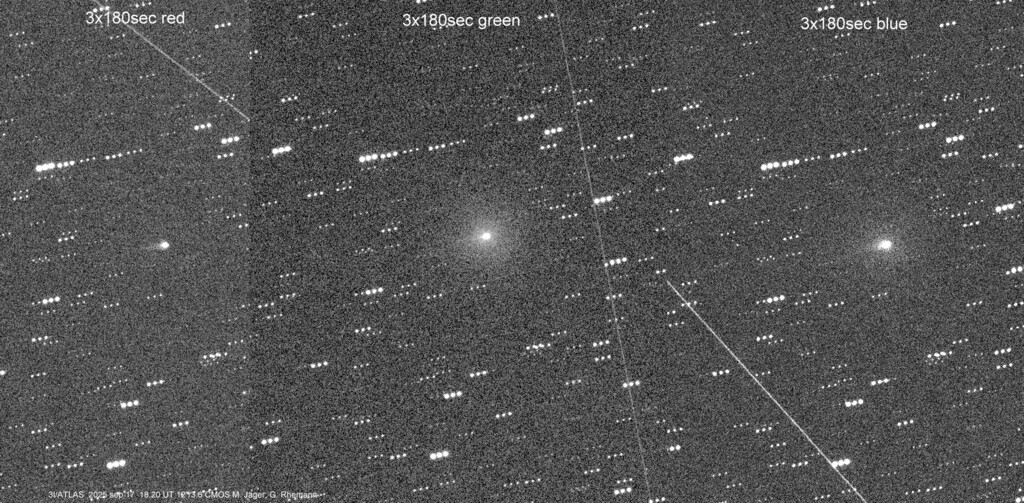 To estimate the brightness, we took the images with a green filter (maximum between 500-570 nm), where the coma is brightest. The blue filter also shows the coma clearly. The tail is clearly visible in blue (400-500 nm) and red (600-680 nm). It is barely visible in the green filter.