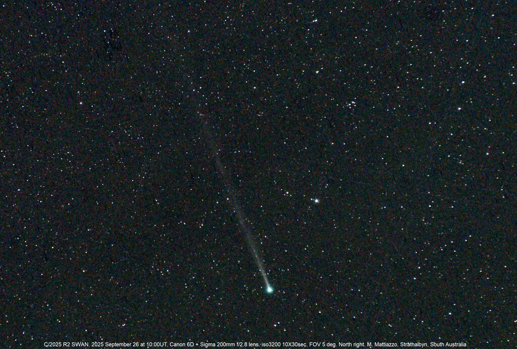 Tonight, C/2025 R2 SWAN seems significantly brighter than 3 nights ago and probably in outbust. The ion tail is also more intense. I estimate mag 6.0 using 8x40m binoculars at 10UT on September 26. 3 nights earlier, I estimated it at mag 6.8. Attached image of C/2025 R2 SWAN taken on 2025 September 26 at 10:00UT using a Canon 6D + Sigma 200mm f/2.8 lens. iso3200 10X30sec. FOV 5 deg. North right. Cheers, M. Mattiazzo. Strathalbyn, South Australia _._,_._,_