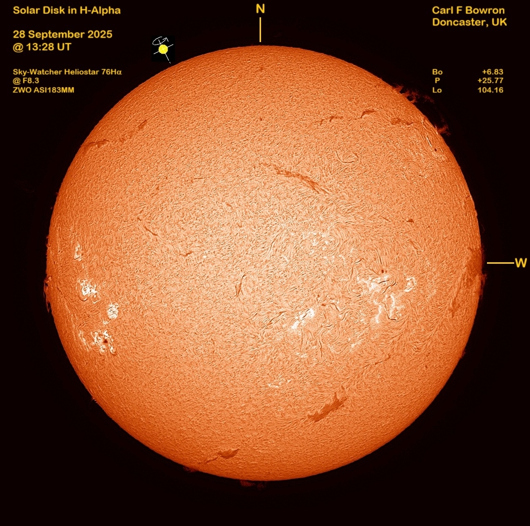 Observation by Carl Bowron: SUN 20250928 1328UT DISK HALPHA CFB