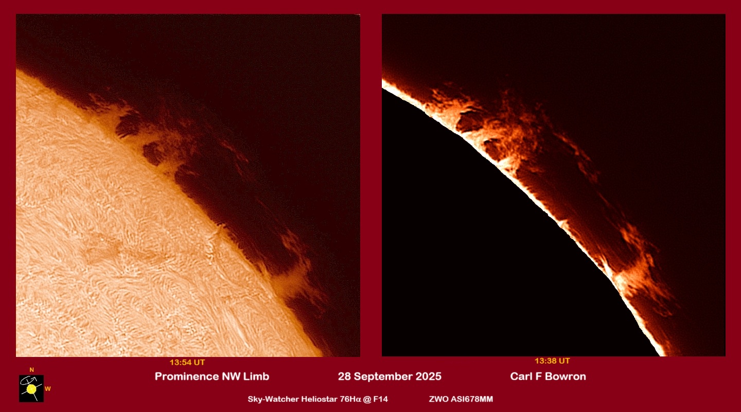 Observation by Carl Bowron: SUN 20250928 1354-1358UT PROM HALPHA col...